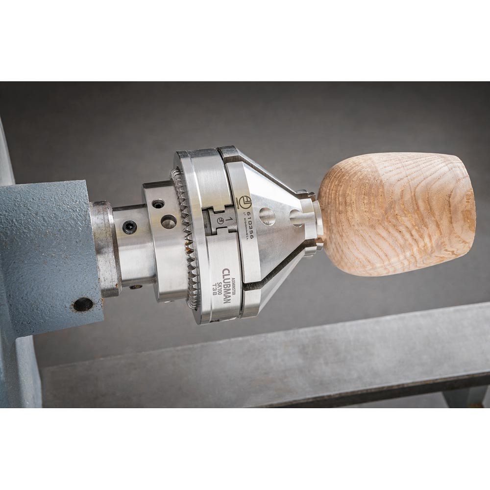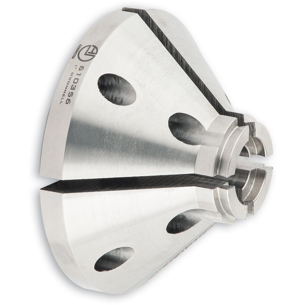 Das einzigartige Design der O'Donnell-Backe ermöglicht den Zugang um die Backen für die Arbeit mit Werkzeugen zum Anfassen. Die Kiefer sind ungefähr 49 mm groß und verjüngen sich zur Nase. Diese Verjüngung gibt den Backen ihren Vorteil beim Arbeiten in der Nähe. Die Mittelbohrung bildet eine tiefe Aussparung zum Halten langer Zapfen und bietet eine solide Befestigung, wenn weit vom Spindelstock weg gedreht wird, ohne dass der Reitstock unterstützt wird. Die Backen sind innen und außen an der Lippe verzahnt. Der 25-mm-O'Donnell-Kiefer erweitert sich in eine 34-mm-Schwalbenschwanzvertiefung und zieht sich auf einen 23-mm-Schwalbenschwanz oder einen 16-mm-Zapfen zusammen. Das Axminster-Futter bietet viel Spielraum; außen 19 mm bis 46 mm und innen 17 mm bis 34 mm Schwalbenschwanz oder 10 mm bis 28 mm Zapfen.