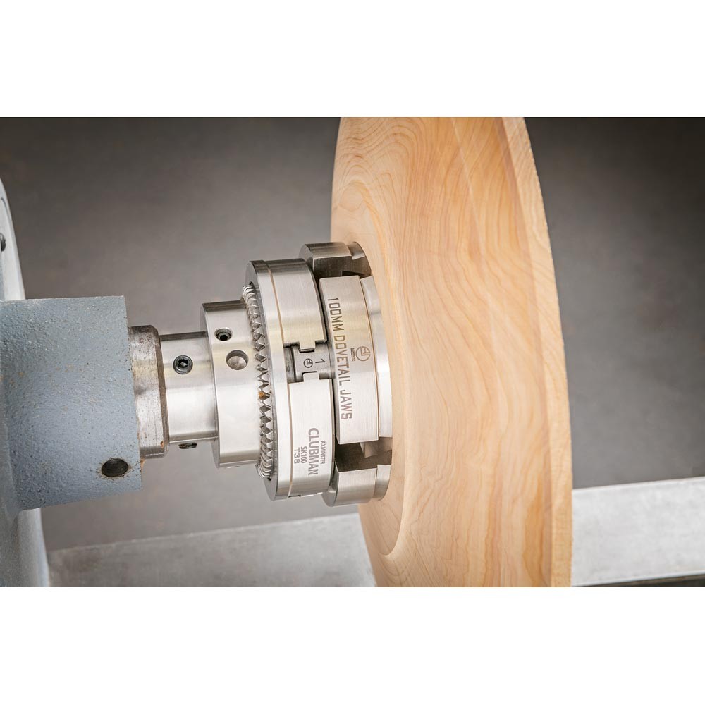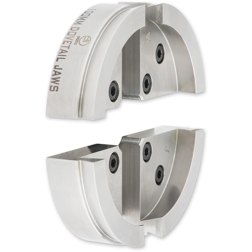 Schwalbenschwanzbacken sind bei weitem die sicherste und genaueste Methode, um eine Schüssel oder einen Teller während des Drehens auf der Drehmaschine zu halten. Hergestellt in Axminster, greifen diese SK100 Schwalbenschwanzbacken vom Typ A Plus in einen 15 ° -Schwalbenschwanzzapfen mit einem Durchmesser von 80 mm oder dehnen sich in eine schwalbenschwanzförmige Aussparung mit einem Durchmesser von 100 mm aus. Wenn die Backen einen echten Kreis bilden, ermöglicht das Spannfutter eine große Variation. Intern können diese Backen 72 mm bis 93 mm greifen und extern in eine Aussparung von 95 mm bis 116 mm expandieren. Bitte beachten Sie, dass bei extremen Durchmessern die Backen keinen echten Kreis mehr bilden.