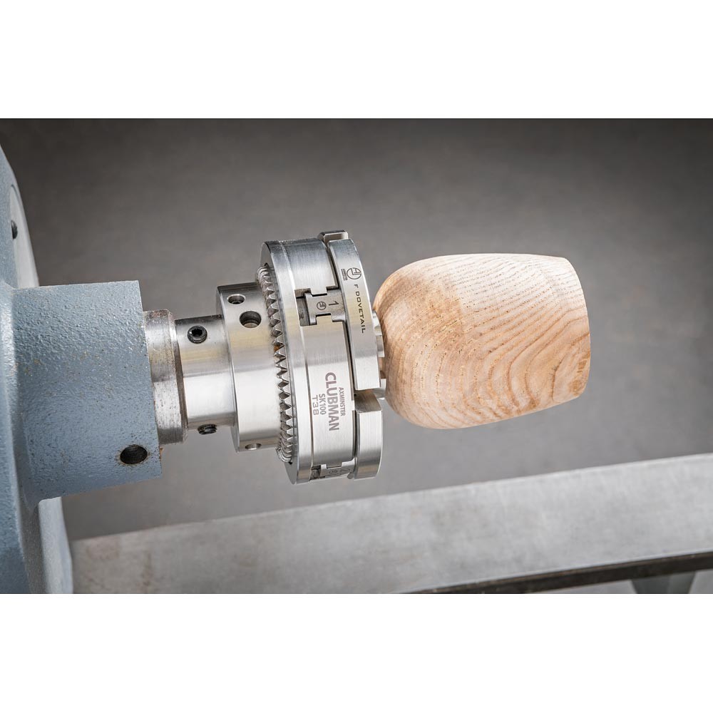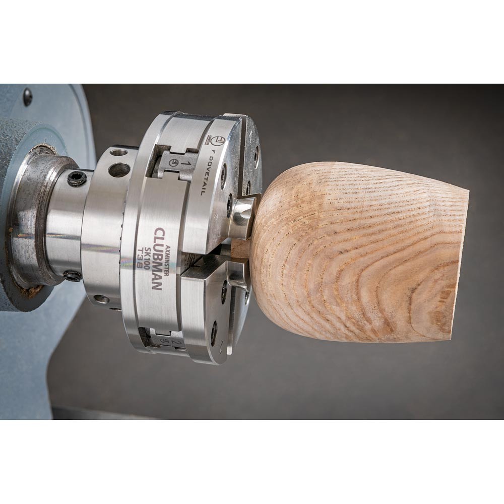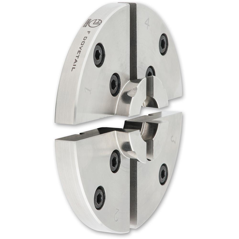 Diese vielseitigen Spannbacken für kleinere Dreharbeiten haben interne und externe Schwalbenschwänze. Die SK100 Schwalbenschwanzbacke Typ F wird auf einen 19-mm-Schwalbenschwanzzapfen geschlossen oder in eine 38-mm-Schwalbenschwanzvertiefung erweitert. Es gibt natürlich größere Variationen aufgrund des Rollmechanismus des Spannfutters. In der Realität beträgt der Innenbereich 11 mm bis 29 mm und der Außenbereich 31 mm bis 48 mm. Bei extremeren Durchmessern bilden die Backen jedoch keinen echten Kreis mehr. Diese Backen sind passend für die Spannfutter SK100 und SK114.