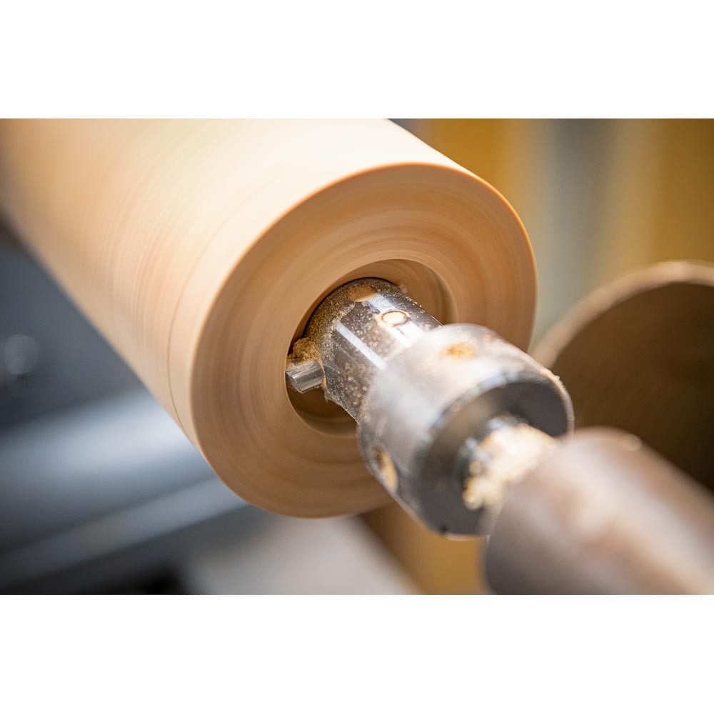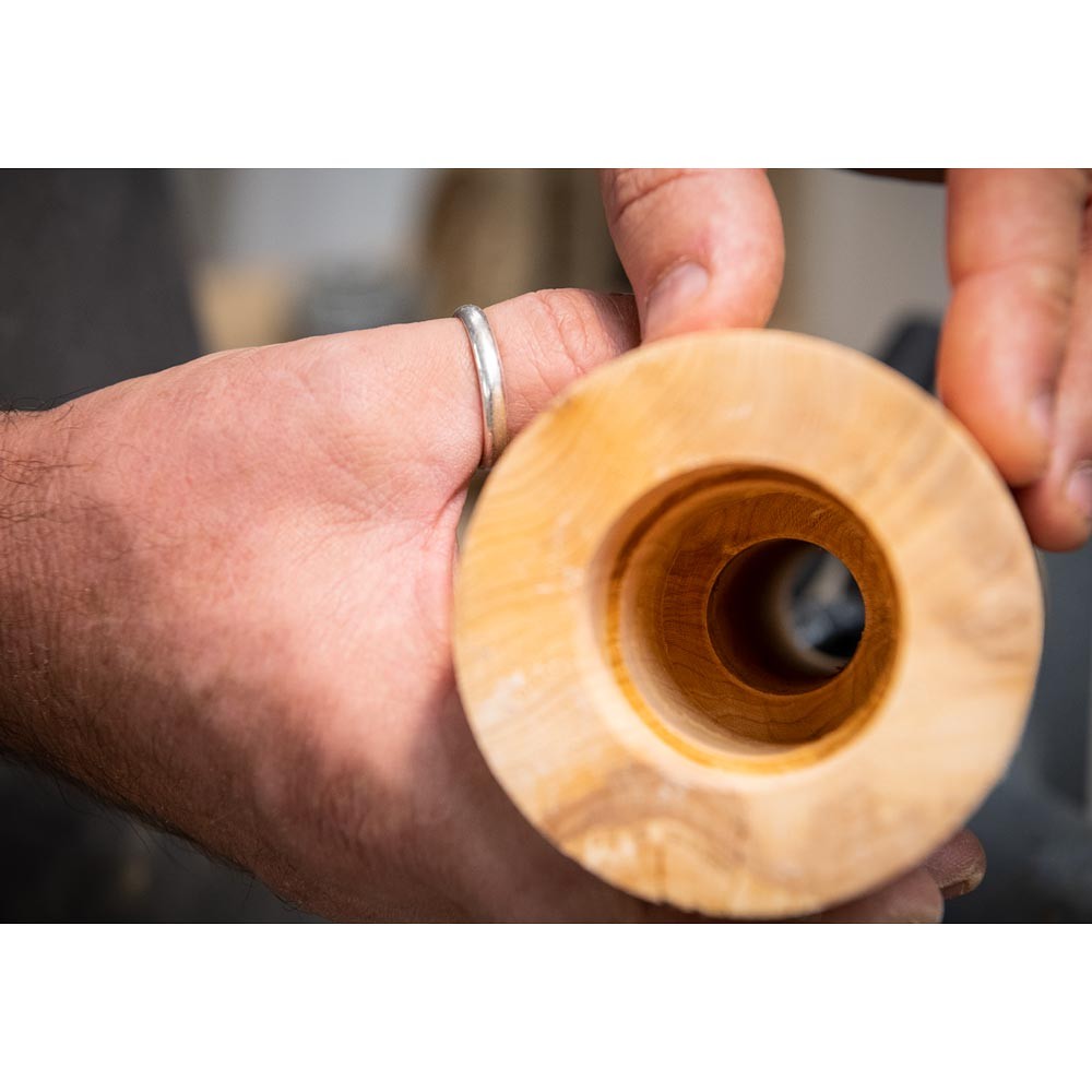 Es wurde vorab für den sofortigen Gebrauch geschärft, muss jedoch erneut geschärft werden, wenn die Messer stumpf oder stumpf werden. Wie regelmäßig Sie die Messer schärfen, hängt vom verwendeten Holz ab. Regelmäßige Ausbesserungen können jedoch mit einem Diamantschleifstein durchgeführt werden. Zum Bohren für den Crushgrind-Mechanismus wird ein 25-mm-Sägezahnfräser oder Forstner benötigt, um zuerst das Loch durch die Mitte des Rohlings zu schneiden.